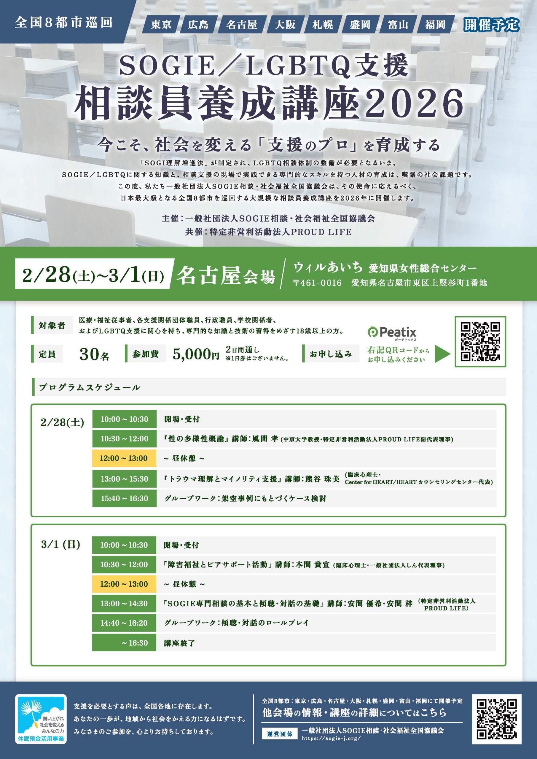 2026年1月22日 お知らせ 【名古屋開催】SOGIE/LGBTQ支援 相談員養成講座2026 2026年1月19日 お知らせ 2月・3月の個別相談の予約受付中 2025年12月26日 お知らせ 年末年始休業のお知らせ 一覧を見る 名古屋・東海地域で活動するNPO法人。当事者が自らの生き方を自信を持って肯定できるようにという意味を込めました。 私たち当事者が声をあげ、理解者をひろげ、社会とつながっていき、行政と協働し他の社会的運動と連帯して行くための活動をしています。 PROUD LIFEとは スタッフ紹介 ご寄付・ご入会のご案内 セクシュアル・マイノリティの当事者や支援者による電話相談・LINE相談 性的指向や性自認のお悩みの支援をする人と社会の多様性を支える支援センター SOGIE(性的指向・性自認・性別表現)に関するLINE相談事業※PROUD LIFEも協力している別団体の取り組みです 当事者が自らの生き方を自信を持って肯定できるように名古屋・東海地域で活動するNPO法人 PROUD LIFEで活動するスタッフのみなさんを紹介 LGBTQ専門相談および一般相談の相談員(候補生)を募集 Tweets by proudlife758
